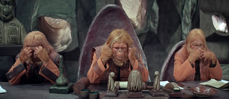 Dans le film de Franklin Shaffner les hommes sont devenus des animaux que l'on traque, privés de droit par les singes élevés au rang d'espèce dominante. L'artifice scénaristique du début (Taylor – Charlton Heston -, blessé à la gorge, ne peut parler et ne peut compter que sur ses mains, son regard et des grognements) transforme le héro en une sorte d'objet d'étude, permettant ainsi au réalisateur de nous faire ressentir la condition d'animal de laboratoire. En fait l'argument principal du livre de Pierre Boulle est repris, à sa manière, par le réalisateur : la société des singes reproduit, comme un miroir, les travers de la société humaine. Prenons 2 exemples ;