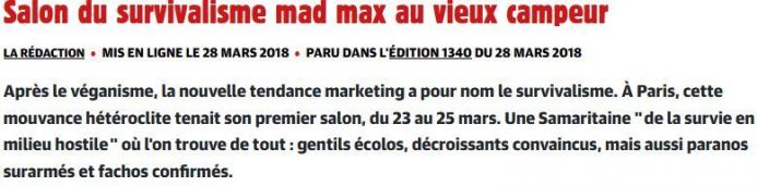 Même si le survivalisme s'est, en partie, affranchi des thèses réactionnaires de son origine américaine, l'image de Mad Max colle encore à cette mouvance comme le montre cet en-tête de Charlie de 2018 :