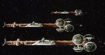 Silent running : les vaisseaux-dômes ; Freeman dans ses serres avec ses droïds.