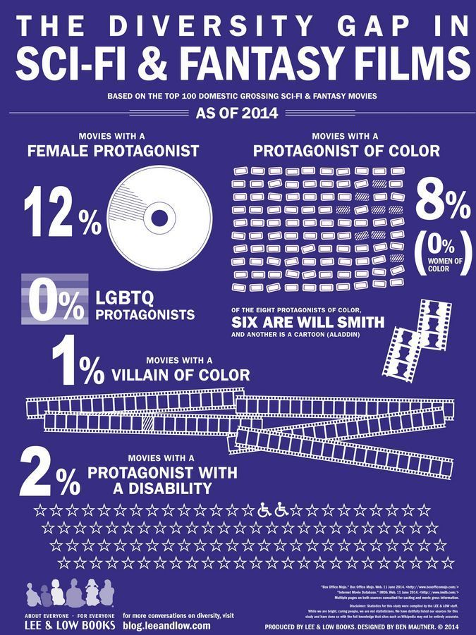 L'infographie présentée plus haut montre que sur 100 protagonistes majeurs des films de Sf et Fantazy de 2014, 8 étaient afroaméricains (dont 6 fois le personnage était interprété par Will Smith)... Cela laisse dubitatif sur la place des minorités dans le cinéma de Sf !