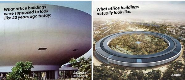 De même les batiments de bureaux du futur ont longtemps été perçus comme de vastes immeubles, au design futuriste, comme les vastes batiments tout en hauteur de Rollerball (Norman Jewison, 1975) mais les campus numériques (sur l'image ci-dessous, le centre d'Apple) n'ont guère été anticipé par le cinéma de Sf !