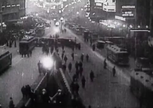 Enfin lorsqu'Aelita (Ioulia Solntseva) observe la terre grâce au télescope de Gor un kaéleidoscope d'images de la dynamique Russie lui apparaît : rues éclairées, foules affairées et tramways pour Moscou ; canons de navires de guerre et grands chantiers ; immensité des steppes russes parcourues par des cavaliers...